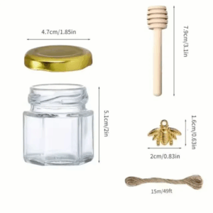 برطمانات عسل، برطمانات زجاجية صغيرة سداسية فاخرة سعة 1.5 اونصة مع غمس خشبي وغطاء ذهبي وقلادة نحلة وحبل من الجوت، زجاجات صغيرة للمربى والحلوى والعسل وحفلات استقبال المولود وحفلات الزفاف