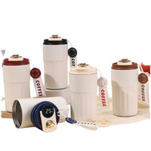 أكواب أنيقة مغطاة بطبقة خارجية من الجلد الفاخر، تجمع بين التصميم العصري والمتانة. توفر قبضة مريحة وتحافظ على درجة حرارة